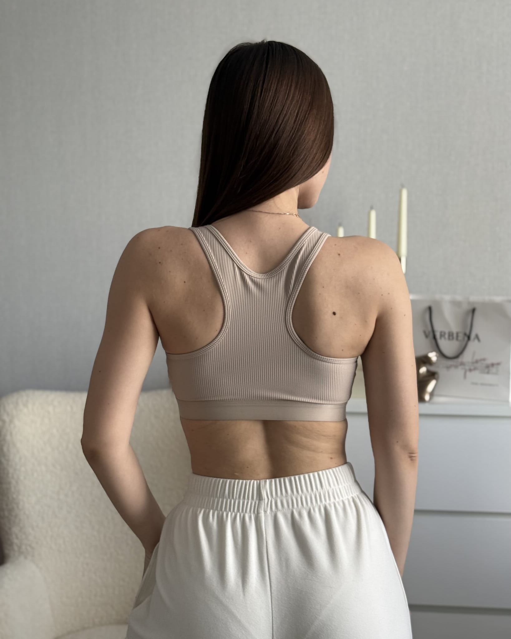 Minimalistyczny top oraz uniwersalna, beżowa kolorystyka sprawiają, że top doskonale komponuje z legginsami treningowymi.